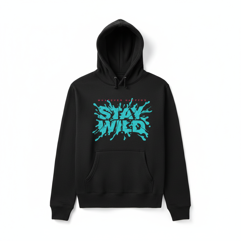 Embrace your adventurous spirit with this bold 'STAY WILD' hoodie! Featuring eye-catching turquoise splatter text with 'WHATEVER HAPPENS' in pink, this design is perfect for free spirits and adventure seekers. The vibrant graphic makes a statement while keeping you comfortable and stylish. Ideal for those who live life on their own terms. Available in black and white.